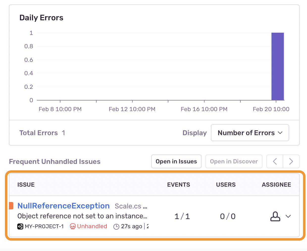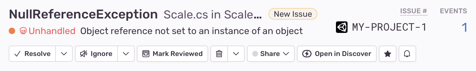We have a new, unhandled issue to resolve. Once we handle this exception, we can click “Resolve”. (I’ll write more about what else we can do to monitor Unity errors in Sentry in a future post).