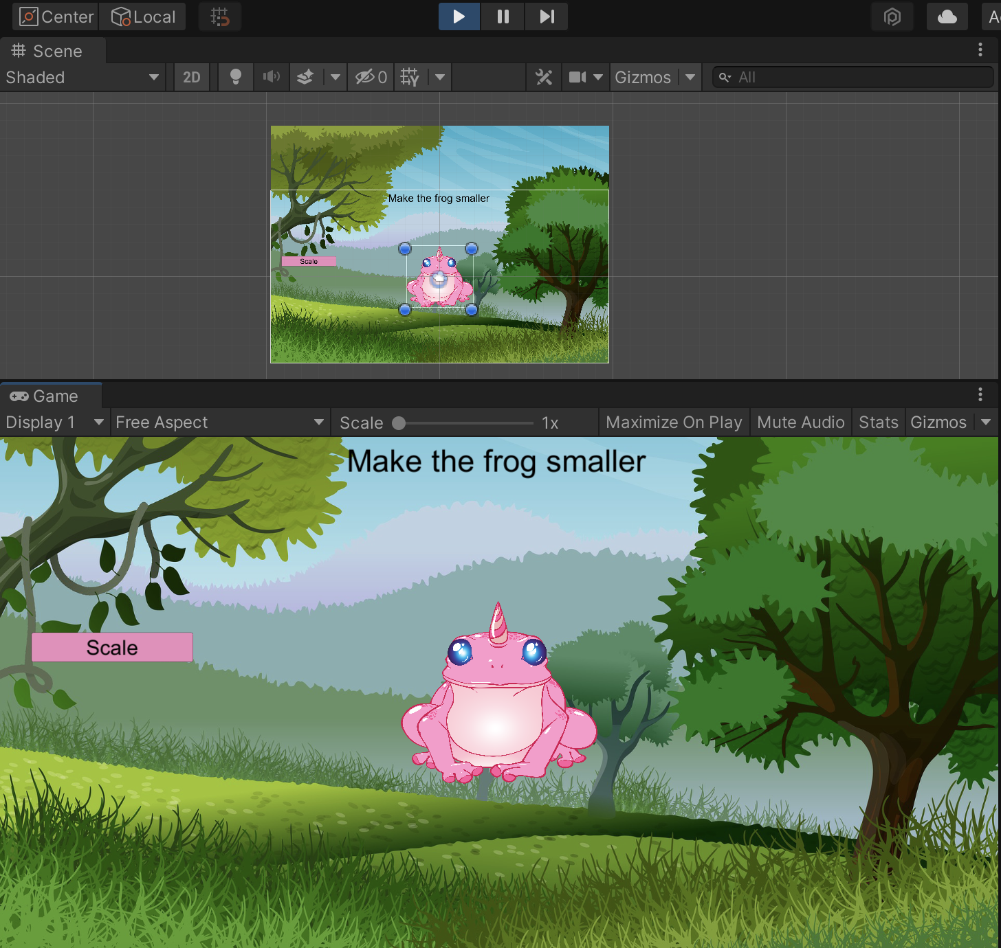 As you can see, the frog is smaller -- and if you check the inspector, the scale values are now 0.2. Once you stop the game, the values will return to their originals.