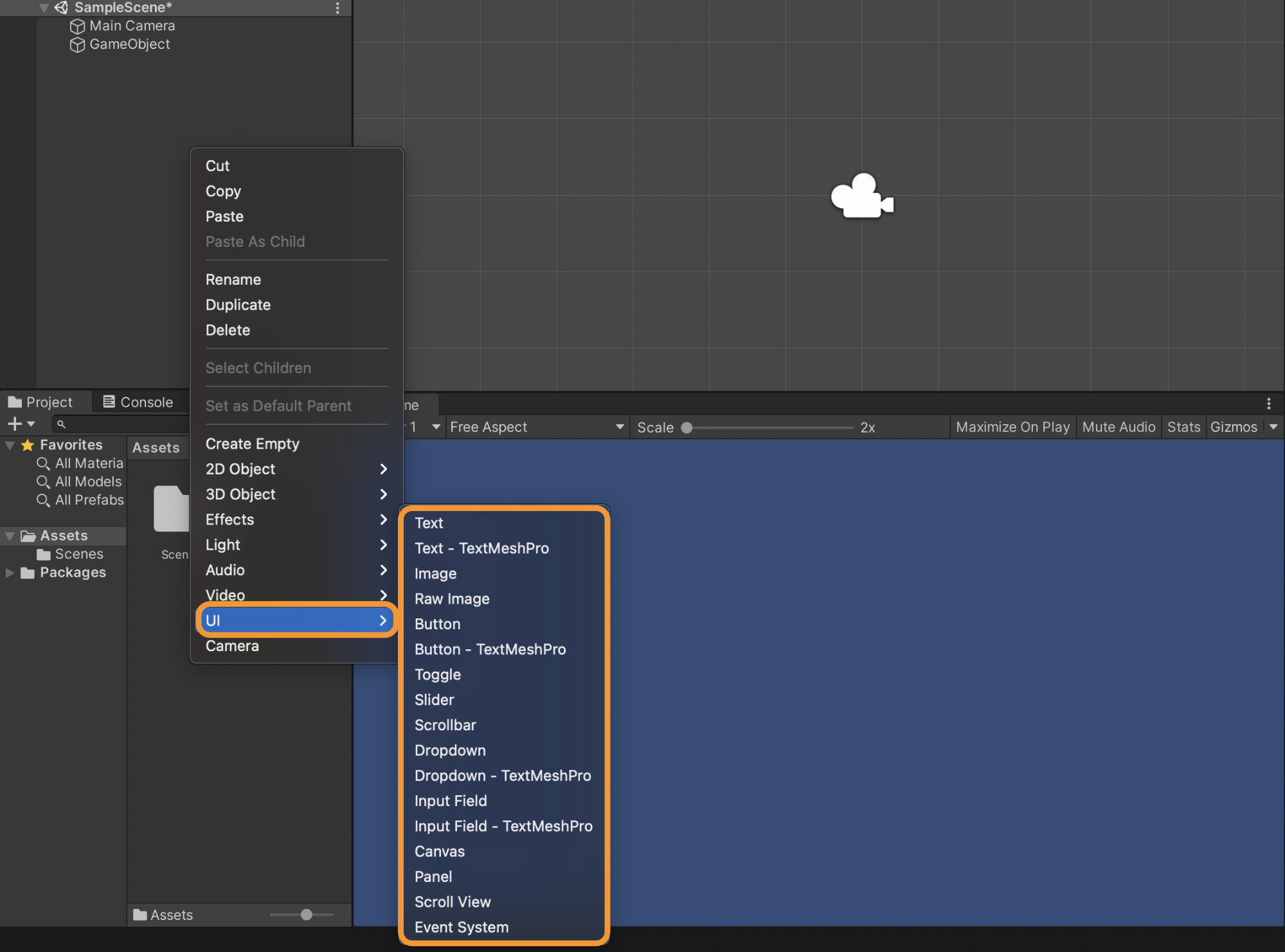 To add these GameObjects to the scene, we right-click in the hierarchy window > UI menu.