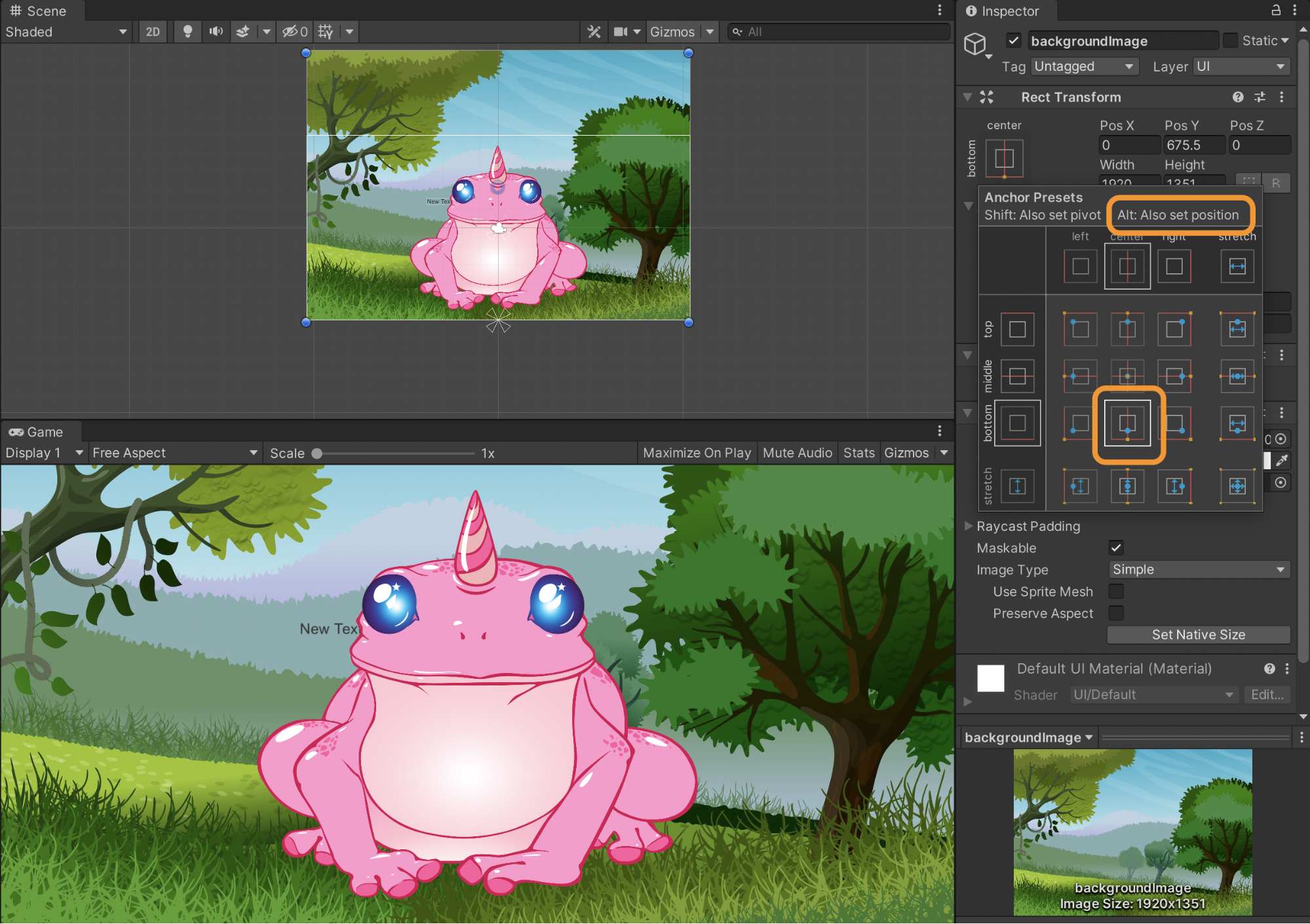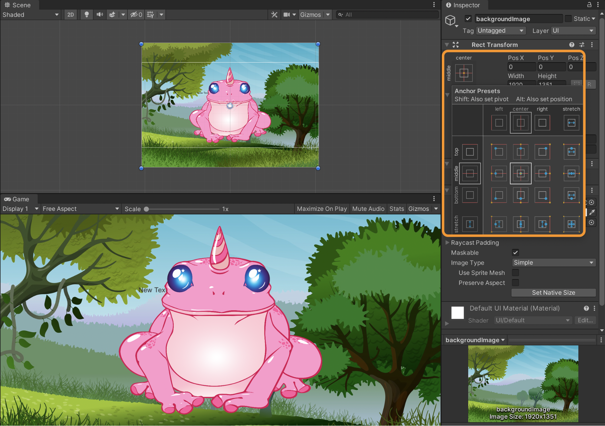 If we want to change the image position and anchors, we can navigate to the “Rect Transform” component for our background image in the image inspector. Select "center-middle" from the anchor presets.