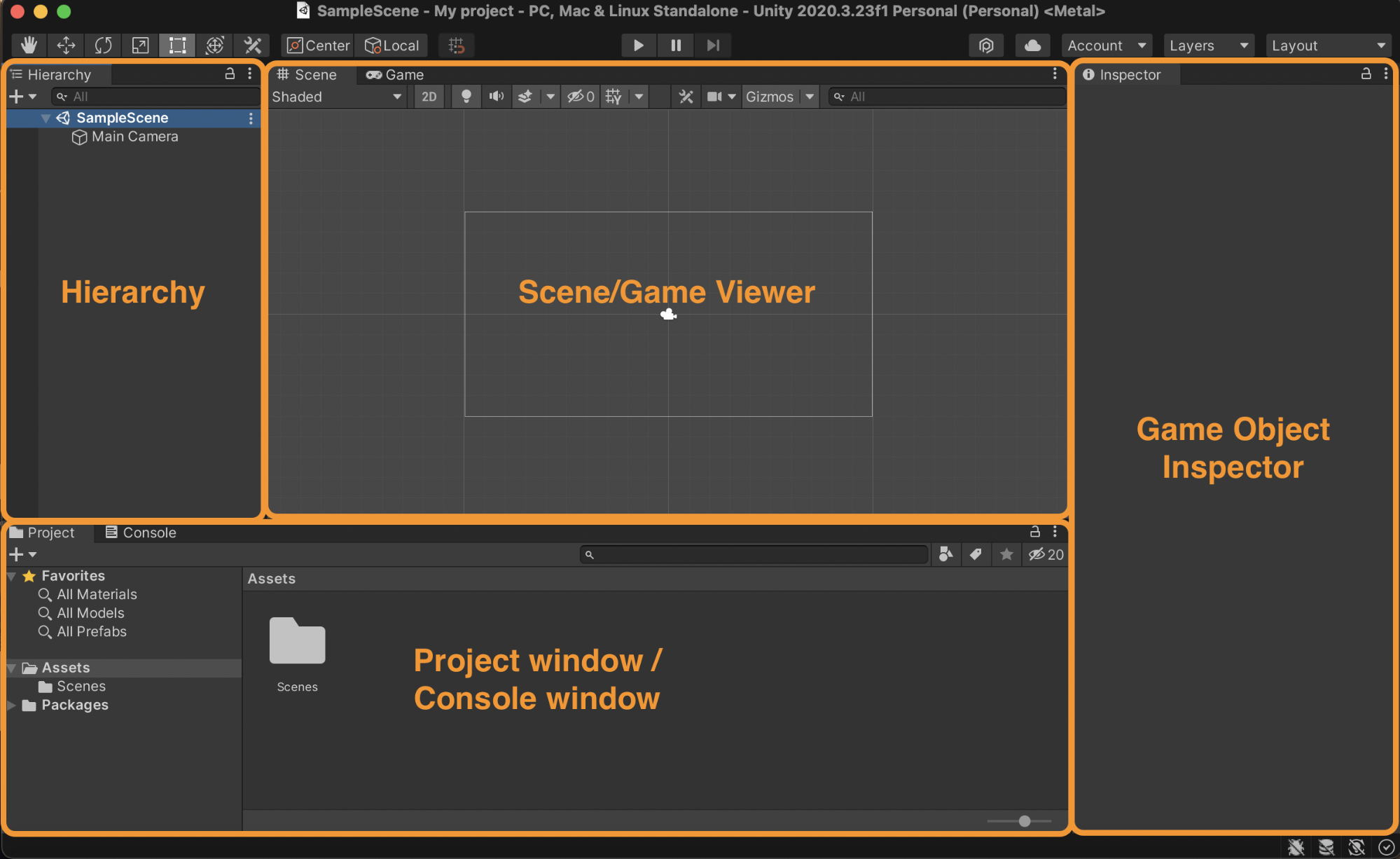 After opening Unity and creating your new project, you'll land in the editor interface (see below). The Unity Editor has several windows. You can edit the layout to whatever suits you. But before changing the layout, let’s understand a little more about each window's capabilities.