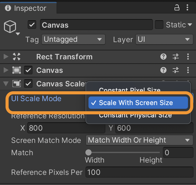 This component lets you choose how the UI elements scale when the screen size changes from device to device. You will normally want it to scale with screen size and that is what we will do. Change the UI Scale mode to "scale with screen size" as shown: