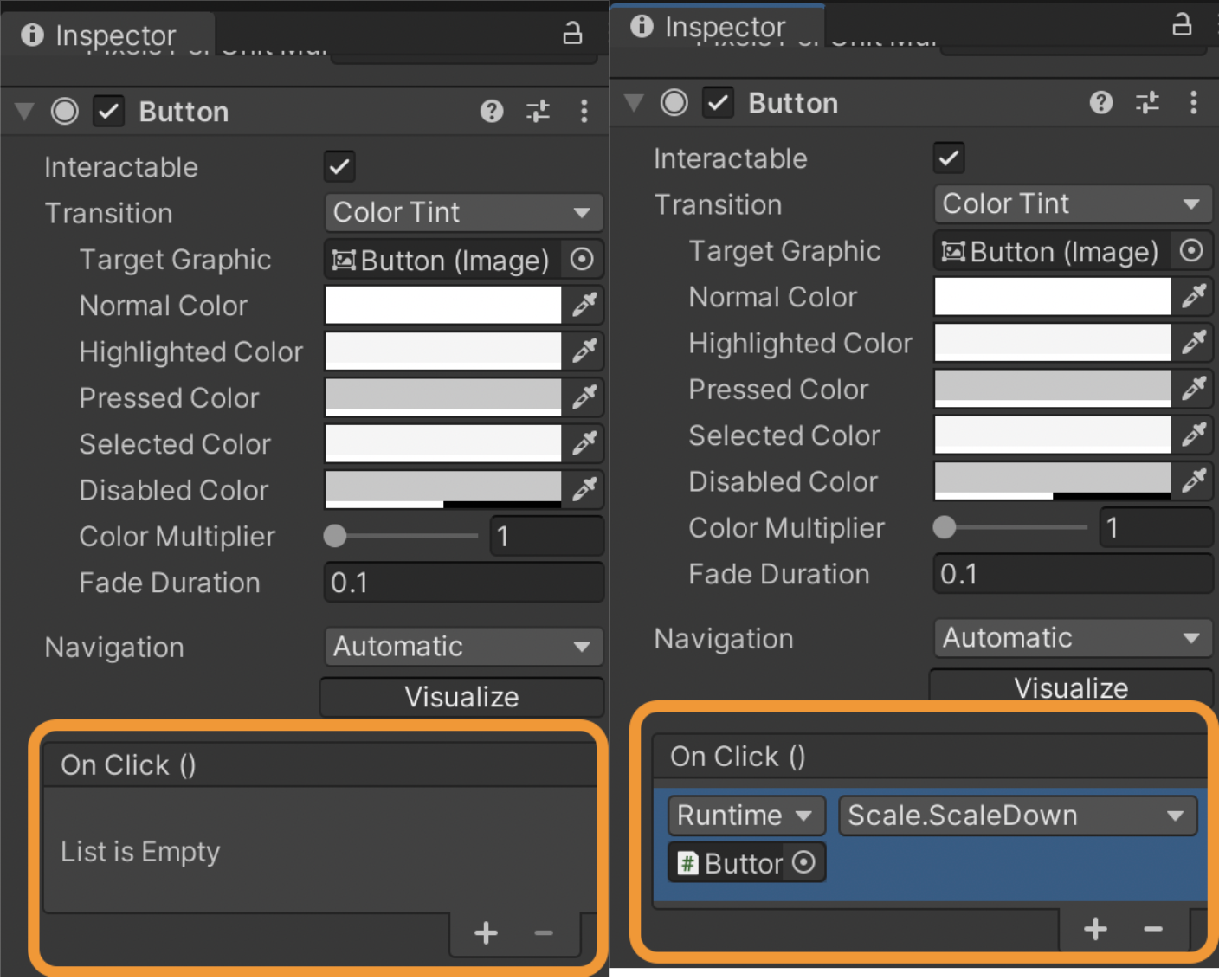 Save the script file and return to Unity to call the function and run the game. Select the button GameObject from the Hierarchy. You will find the OnClick() list in the button component in the inspector as shown in the image below. Click “+” and add the function we just created in the script. Since the script is attached to the button itself, drag and drop the button GameObject from Hierarchy to the empty GameObject area and select the “ScaleDown()” function from the drop down menu.