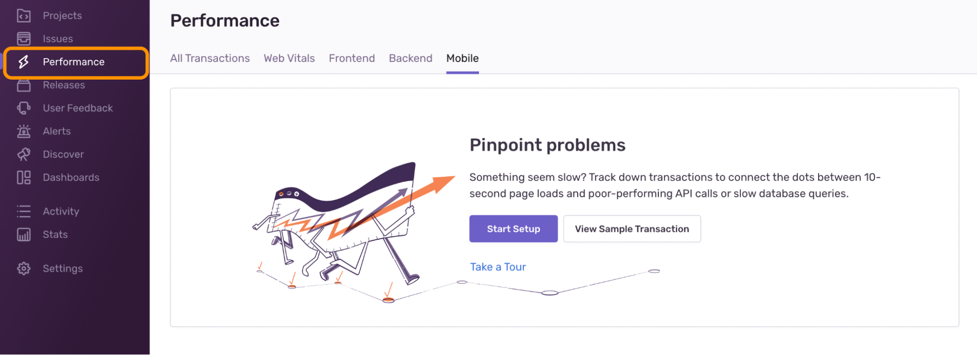 A laggy game is a sure way to make someone stop playing. In addition to catching errors, it's also important to monitor slowdowns or crashes in our game. We can get started by clicking "Performance" within Sentry.