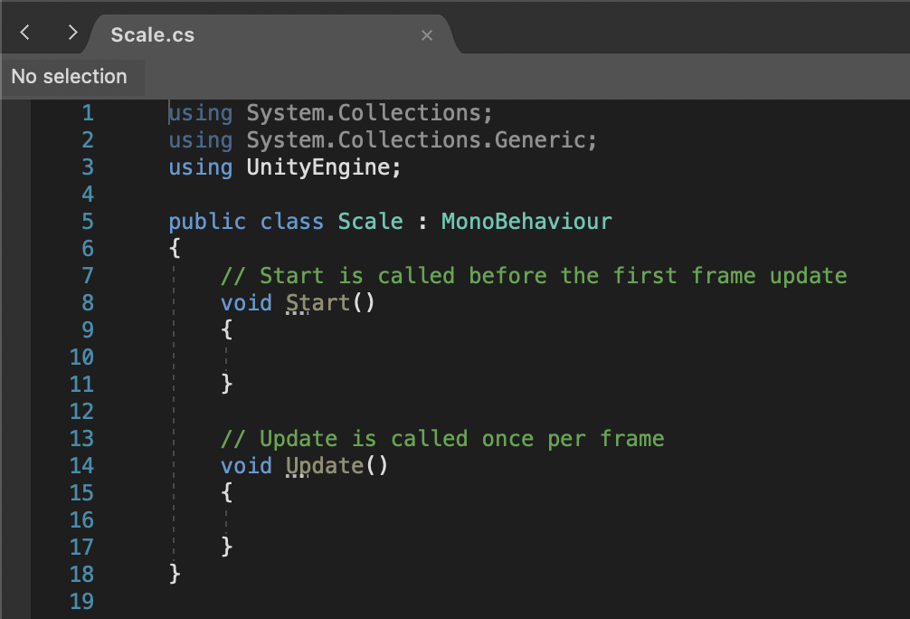 Unity defaults to Visual Studio for editing, but you can select any editor you prefer from the "External Tools" panel in preferences. After double clicking on the "Scale" script we're taken to our editor with some initial content like this: