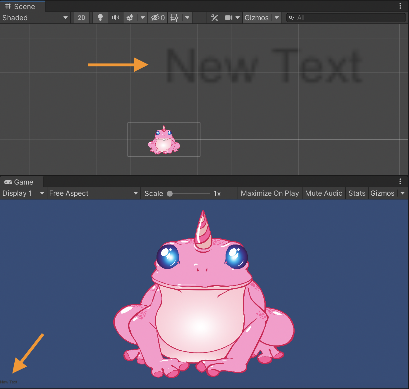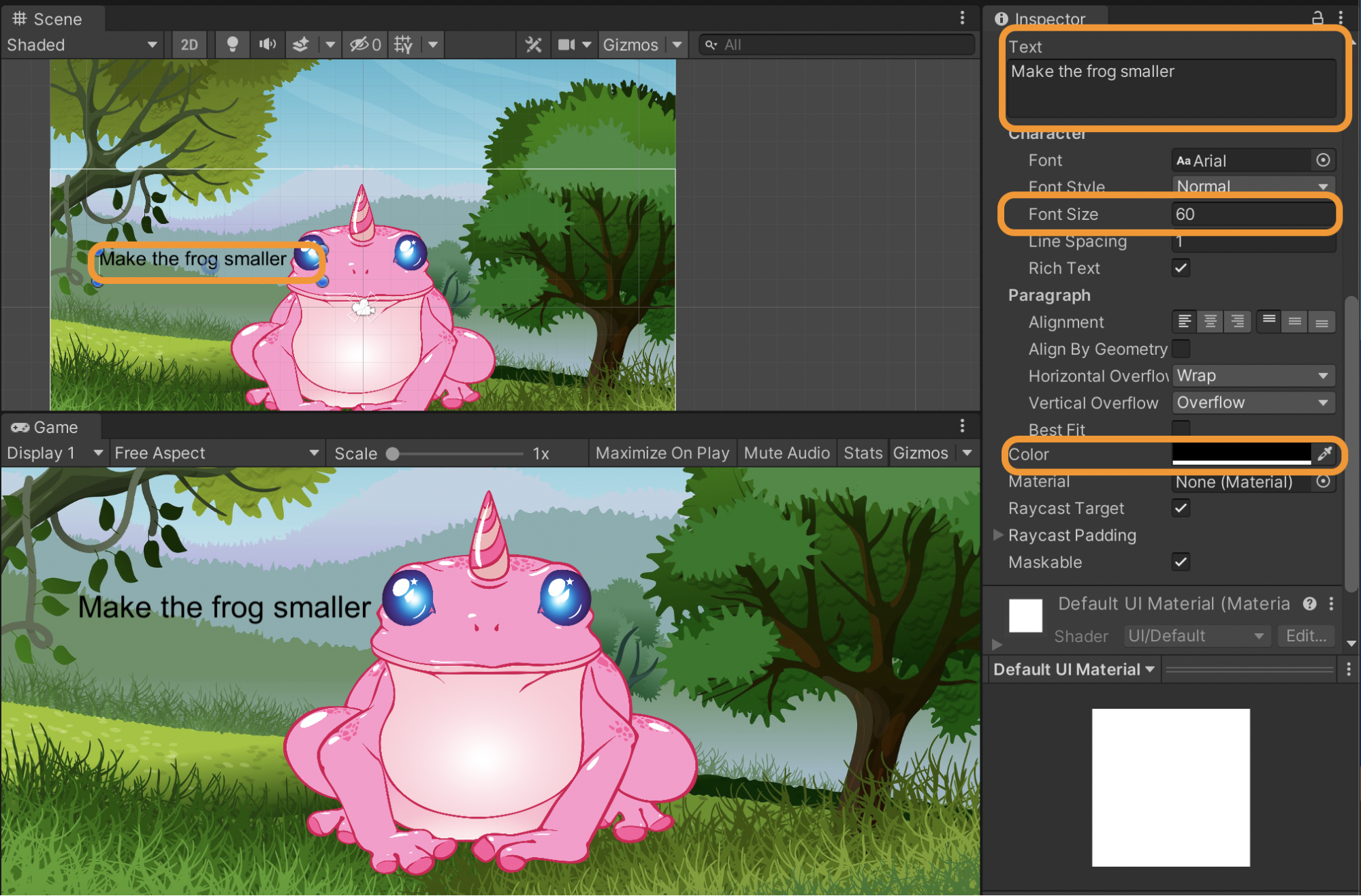 I changed the font size to 60 and edited it to say “Make the frog smaller”, changed the text color to black, and made the text object wider by dragging in the scene viewer. You may have noticed the text object disappears (if you happened to move it over top of the frog) as the frog is a Sprite, not an image.
