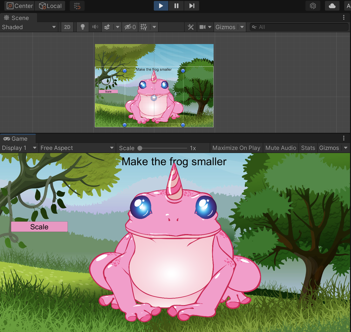 To scale down the frog when we click on the Scale button, we will make a new function, public void ScaleDown(){}, so we can call this function when we click on the Scale button.