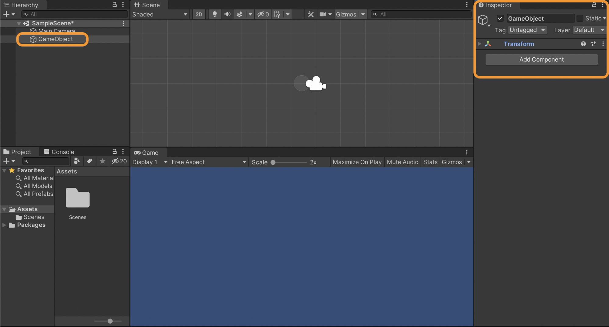 According to the image above, the empty GameObject only has a Transform component. We will talk about the Transform component a little later. As you can see in the Scene window, only the Main Camera is shown. The Main Camera has some special components like Gizmos which can easily be found in the scene view.