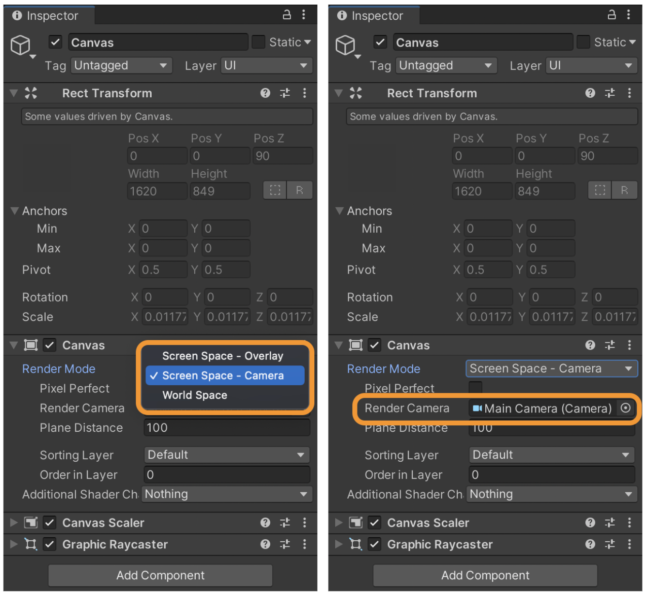 To adjust, we can change the Render mode to “Screen Space - Camera” and drag and drop the “Main Camera” from the Hierarchy into the Render Camera component as shown in the two images below.