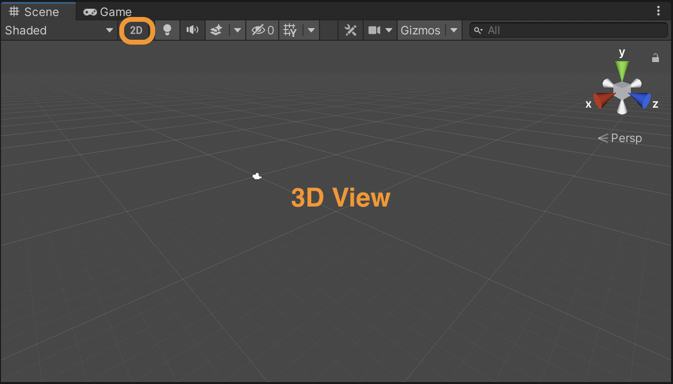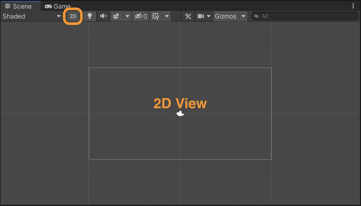 A Scene is where the actual content of your game lives. The scene can be a menu scene, a level scene, a game scene, etc. You can view the scene in 2d and 3d view, even if it is a 2d project. To do so, just toggle the 2d button as shown in the image below. In this window you can select, position, and/or modify the GameObjects.