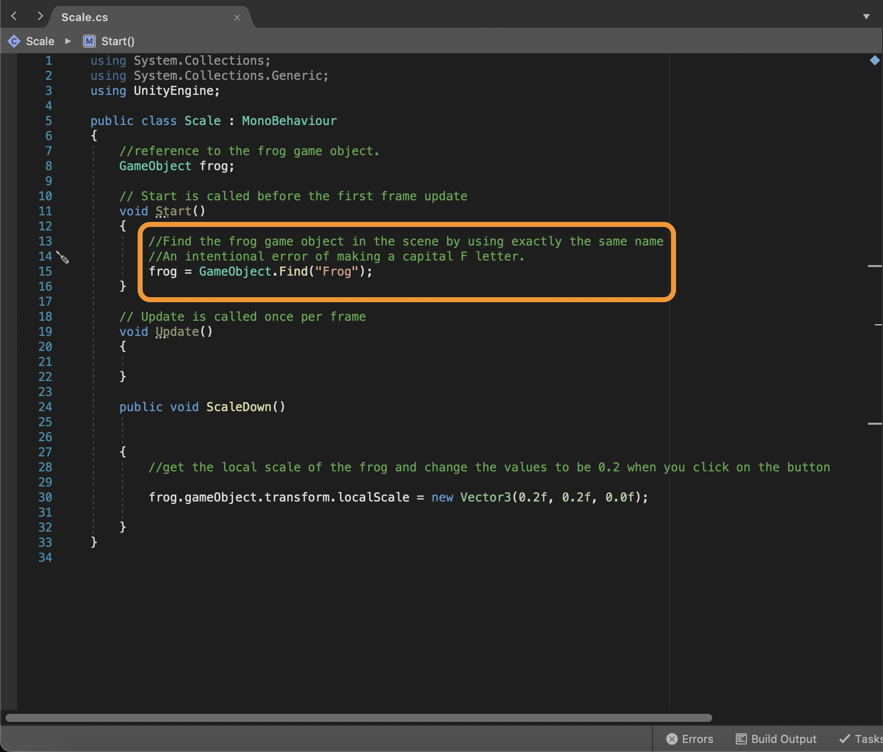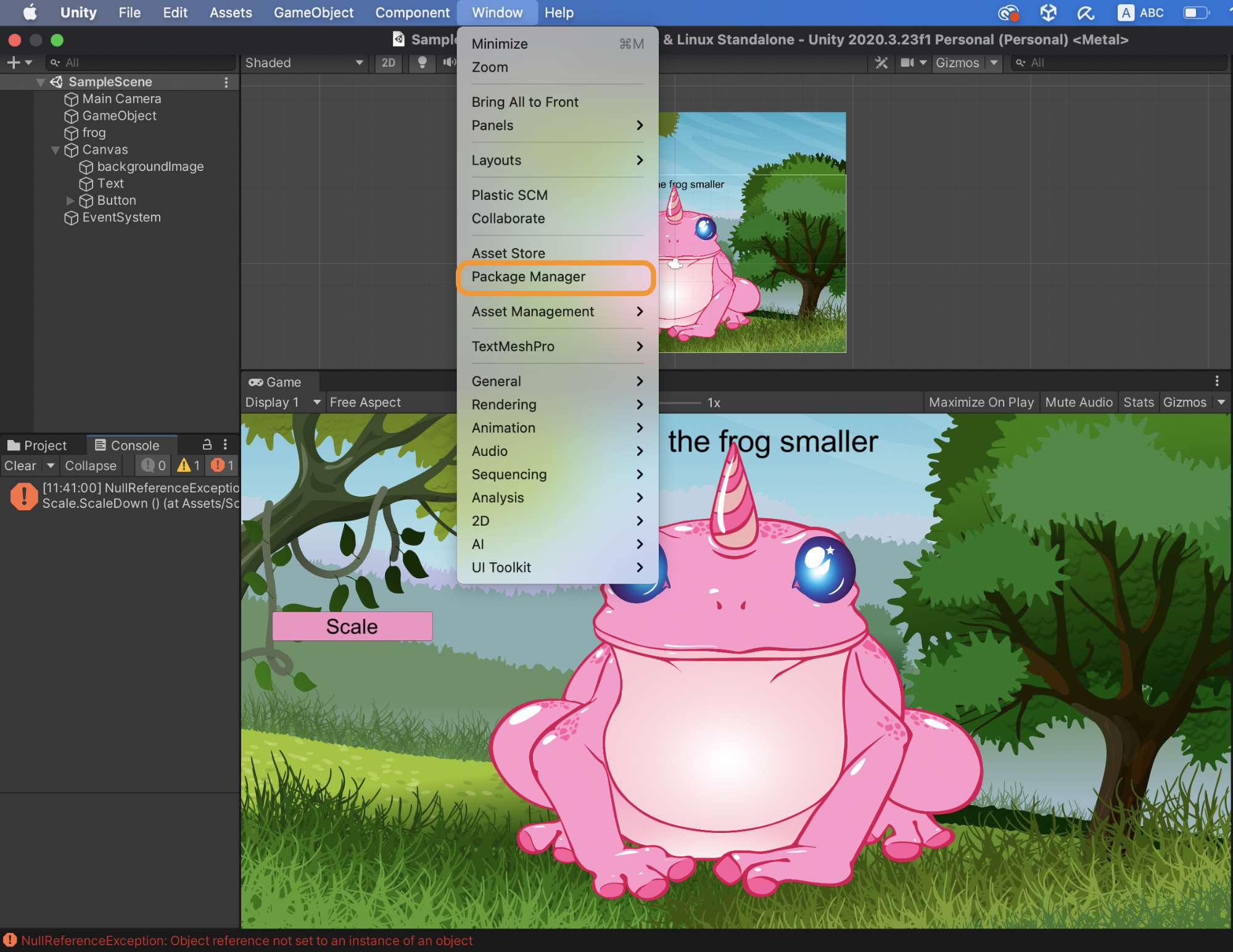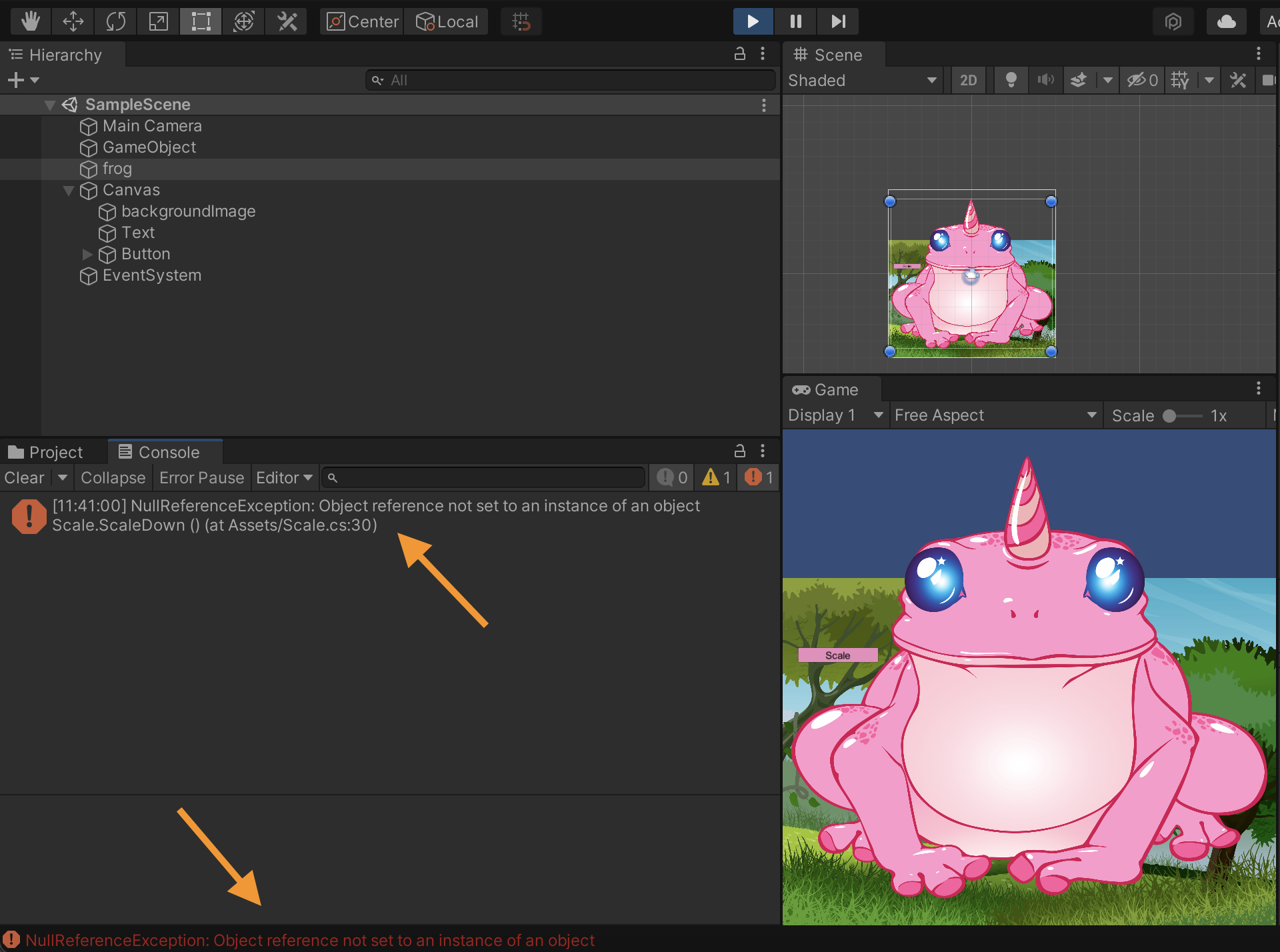 As seen below, we triggered a Null exception error as there is no GameObject called “Frog”.