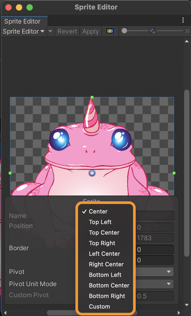 To open the Sprite Editor window: From the menu bar, select Window > Select 2D > Sprite Editor, then select the value from the Pivot dropdown window (center is the default).