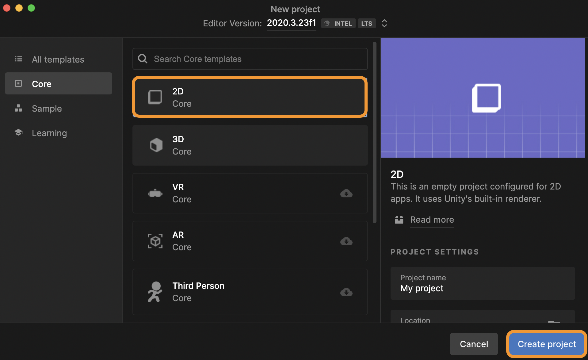 Start by opening Unity Hub > Click on New Project > Select 2D > Click on Create Project.