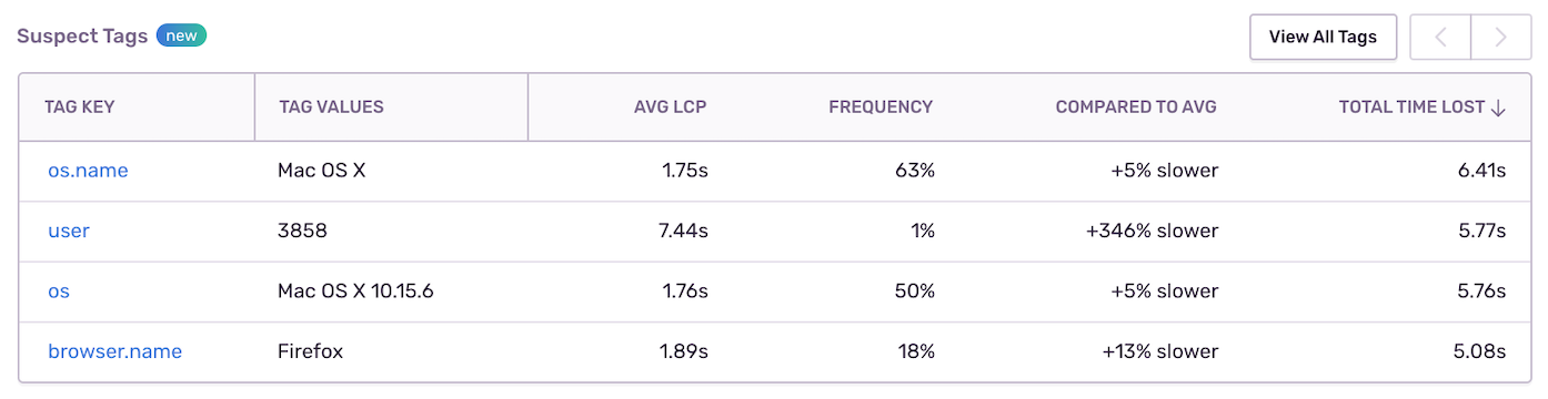 When you’re optimizing your application for performance, it helps to understand the user conditions where the slowest transactions occurred, such as OS, browser type, and even connection type. However, with performance data, it can be hard to see the forest through the trees. Suspect Tags make it easier to find specific performance issues, rule out user conditions outside your control, and in general, have a better grasp of performance within your application.