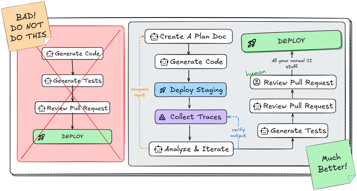 Even with a suite of AI tools reviewing our PRs, or generating tests, we still feel uneasy shipping AI generated code. How do we know our vibe-coded feature won’t take down production? How do we even know if it actually works at all? I have even seen my agents comment out huge portions of code just to get a build to pass.