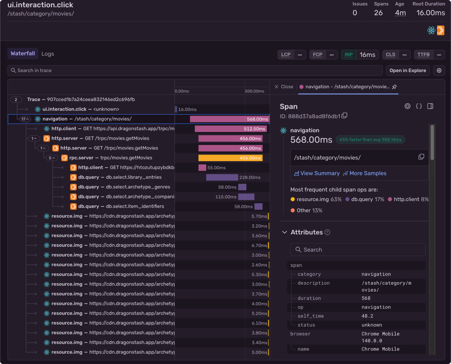 In this example, we can see the user navigated to a page /stash/category/movies/ , and all of the subsequent operations that kicked off from there took a total of 0.568 seconds.