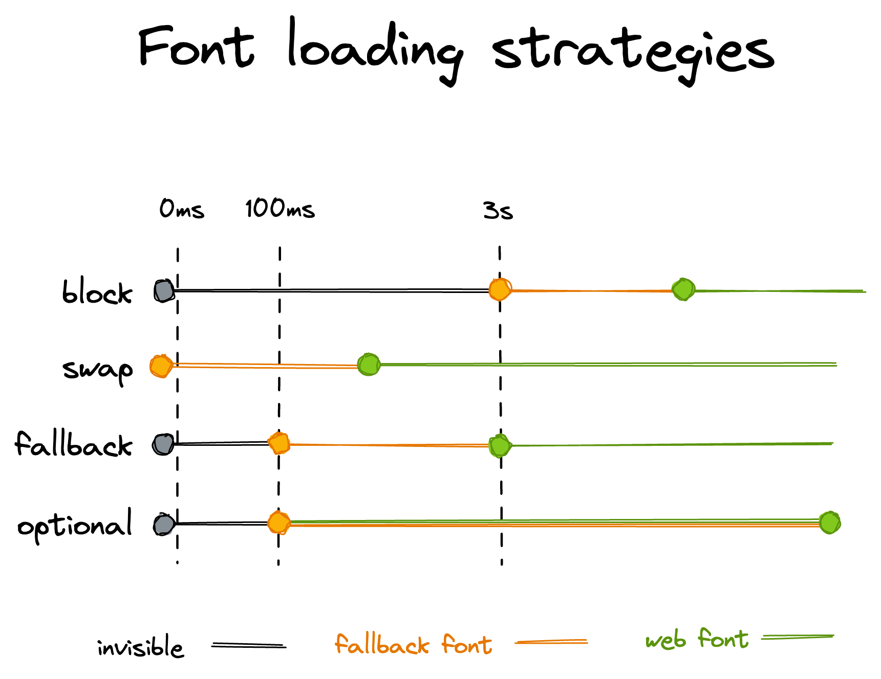 auto: The font display strategy is up to the browser. It’s the default value.block: It gives the font a short block period and an infinite swap period. We’ll talk about these in a bit.swap: No block period and an infinite swap period.fallback: Extremely small block period and a short swap period.optional: Extremely small block period and no swap period.